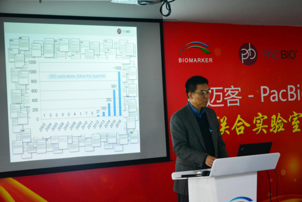 ? 接下來的學(xué)術(shù)交流環(huán)節(jié),PacBio公司亞太區(qū)市場部高級經(jīng)理錢祖衛(wèi)博士帶來了三代測序技術(shù)應(yīng)用的精彩分享,百邁客基因組高級技術(shù)總監(jiān)紀長綿分享了百邁客 公司與浙江大學(xué)借助三代測序等技術(shù)在Nature Genetics上發(fā)表的芥菜基因組文章,百邁客云市場部經(jīng)理孫瑛女士為大家介紹了百邁客云。儀式最后階段,基因組測序研發(fā)經(jīng)理楊帆帶領(lǐng)參會人員參觀了百 邁客的實驗室,講解了百邁客的發(fā)展歷程。