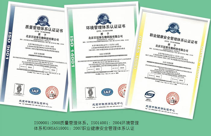 近日,北京百邁客生物科技有限公司順利通過ISO9001:2008質(zhì)量管理體系、ISO14001:2004環(huán)境管理體系和OHSAS18001:2007職業(yè)健康安全管理體系認(rèn)證(簡稱QES),這標(biāo)志著公司向管理標(biāo)準(zhǔn)化、規(guī)范化和程序化方向發(fā)展邁進(jìn)了一大步。