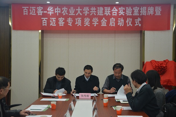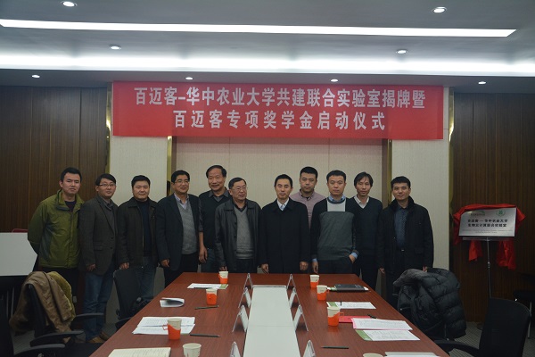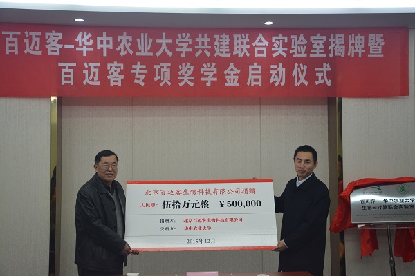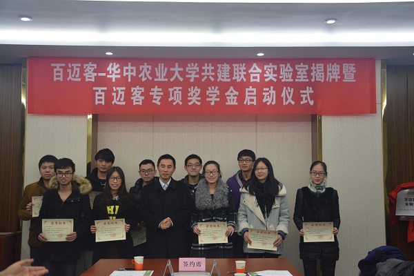 在商用云計算平臺成功上線后,百邁客啟動了云平臺戰(zhàn)略又一重大舉措-全國重點區(qū)域的布點及人才隊伍建設(shè)。2015年12月1日 ,“百邁客-華中農(nóng)業(yè)大學(xué)共建聯(lián)合實驗室揭牌暨獎學(xué)金頒發(fā)儀式”在華中農(nóng)業(yè)大學(xué)隆重舉行。