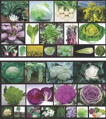 蕓薹屬包括三個(gè)二倍體物種:蕓薹(Brassica rapa)、黑芥(B. nigra)和甘藍(lán)(B. oleracea),這三個(gè)基本種經(jīng)過兩兩雜交又產(chǎn)生了四倍體的歐洲油菜(B. napus)、非洲油菜(B. carinata)和芥菜(B. juncea),這就是“禹氏三角”。隨著人工馴化和持續(xù)的育種工作,這些物種產(chǎn)生了高度多樣化的形態(tài)型,例如結(jié)成球狀的葉片、膨大的塊莖(或根 部、頂芽、腋芽等)。有意思的是,某些物種的形態(tài)型,盡管是在不同的地區(qū)獨(dú)立培育而成,但卻表現(xiàn)出相似的表型特征,這便是趨同馴化的結(jié)果。
