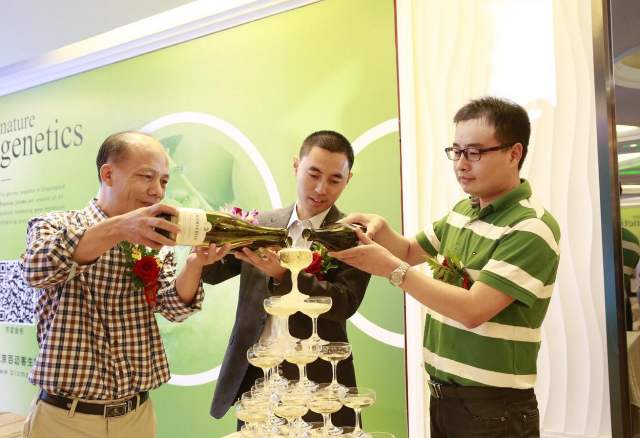 會(huì)中,眾嘉賓同時(shí)為發(fā)布會(huì)揭幕,迎來(lái)全場(chǎng)嘉賓們的矚目及掌聲,制作精美的大型雜志模型浮現(xiàn),同時(shí)芥菜基因組數(shù)據(jù)全球同步發(fā)布。接下來(lái)中國(guó)農(nóng)科院王曉武教 授、百邁客鄭洪坤總裁、浙江大學(xué)楊景華教授一起澆注香檳塔。于軍老師等嘉賓隨后一同舉杯,共同祝賀蕓薹屬科研成果的發(fā)布。會(huì)上有二十幾家媒體到場(chǎng),媒體提 問(wèn)環(huán)節(jié)也十分引人注目,cctv4、科技日?qǐng)?bào)提出了百姓關(guān)注的餐桌問(wèn)題;測(cè)序中國(guó)、生物探索、生物谷行業(yè)媒體就兩篇論文的基因組發(fā)布技術(shù)和潛在的應(yīng)用前景 與嘉賓進(jìn)行探討,嘉賓們紛紛做了精彩的回答。