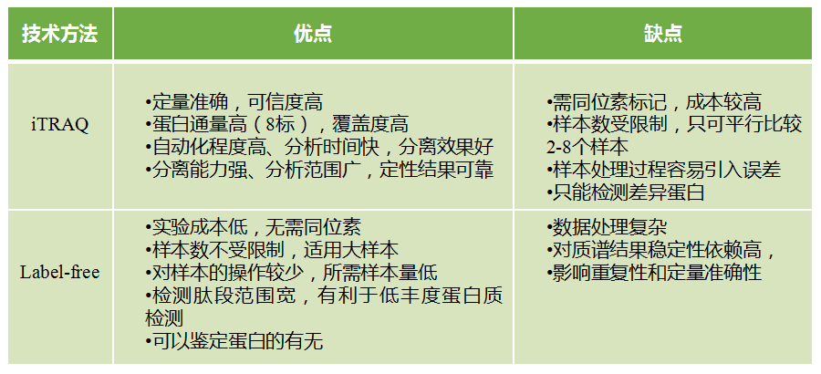 以質譜為基礎的定量蛋白質組學,主要可以分成兩類,第一種是穩(wěn)定同位素標記的定量蛋白質組學,比如iTRAQ;第二種是非標記的定量蛋白質組學技術,比如label-free。iTRAQ定性定量結果更為準確,通量較高可同時標記2-8個樣本,但是對樣本數(shù)有一定限制且不適用于低豐度蛋白的定量,適合小樣本量的項目;label-free檢測肽段范圍廣,單次可鑒定和定量較多的蛋白質,但由于樣品單獨進行質譜檢測所以重現(xiàn)性較低,在大量算法的基礎上更適合大量樣本的蛋白組研究。