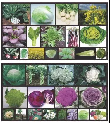 蕓薹屬包括三個二倍體物種:蕓薹(Brassica rapa)、黑芥(B. nigra)和甘藍(B. oleracea),這三個基本種經(jīng)過兩兩雜交又產(chǎn)生了四倍體的歐洲油菜(B. napus)、非洲油菜(B. carinata)和芥菜(B. juncea),這就是“禹氏三角”。隨著人工馴化和持續(xù)的育種工作,這些物種產(chǎn)生了高度多樣化的形態(tài)型,例如結(jié)成球狀的葉片、膨大的塊莖(或根部、頂芽、腋芽等)。有意思的是,某些物種的形態(tài)型,盡管是在不同的地區(qū)獨立培育而成,但卻表現(xiàn)出相似的表型特征,這便是趨同馴化的結(jié)果。