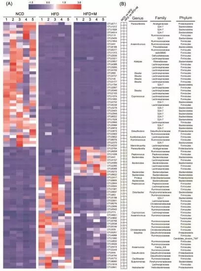 1) ?如下圖顯示,在三個分組中一共找到85個相對豐度有顯著差異的OUT。與NCD組相比,HFD組有27個相對豐度顯著增高的OTU,42個顯著降低的OTU。與HFD組相比,添加了褪黑素的組有10個相對豐度顯著增高的OTU,20個顯著降低的OTU;而在這30個差異性的OTU中,有14個OTU的變化方向與和NCD組比較的結(jié)果完全相反。這14個OTU屬于Ruminococcaceae、DesulfovibrionaceaeBacteroides、PorphyromonadaceaeHelicobacteraceae、Christensenellaceae,有研究表明這些微生物與肥胖相關(guān)。