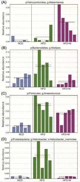 2) LEfSe分析,發(fā)現(xiàn)褪黑素顯著提高Akkermansia的相對豐度,Akkermansia即是降低高脂肪膳食小鼠體重的有益菌。而褪黑素顯著降低Alistipes、Anaerotruncus、Helicobacter?marmotae的相對豐度,則這三種細菌預(yù)防肥胖的有害菌。總之,褪黑素能夠使高脂肪膳食小鼠的腸道菌群由失調(diào)狀態(tài)轉(zhuǎn)為正常狀態(tài),從而抑制體重的增加。