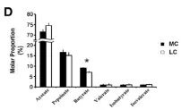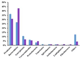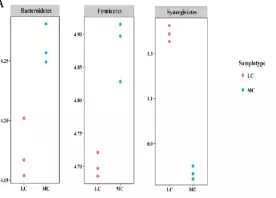 在細(xì)菌門水平,一共有14個(gè)原核的門被鑒定,主要是厚壁菌門(35.7-30.1%),擬桿菌門(26.6-43.6%)、互養(yǎng)菌門(11-7%),且通過門水平維恩圖分析發(fā)現(xiàn),在兩組(MC和LC)間門水平組成相同,比較分析兩組間微生物變化情況發(fā)現(xiàn)(如圖:FIG2),MC組相比于LC組,互養(yǎng)菌門增長(zhǎng)了57%,無壁菌門增長(zhǎng)了330%。而黏膠球形菌門降低了63%,纖維桿菌門降低了65%;