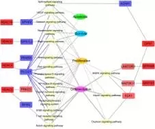 在上皮細(xì)胞生長(zhǎng)網(wǎng)絡(luò)中,基因GPR1,89和155的表達(dá)上調(diào)導(dǎo)致LAMTOR3蛋白,蛋白激酶和ELK1表達(dá)上調(diào),這三種蛋白都存在于MAPK信號(hào)通路上,和細(xì)胞的增殖分化有關(guān)。此外,GPR1的 表達(dá)增加和酸性酰胺酶(ASAH1)的下調(diào)相關(guān),ASAH1存在于調(diào)節(jié)細(xì)胞凋亡、生存和增殖的信號(hào)通路上。對(duì)于HDACs家族基因HDAC4,5,6和10基因的上調(diào)和五個(gè)調(diào)節(jié)細(xì)胞凋亡,生存和增殖基因的下調(diào)有關(guān)。