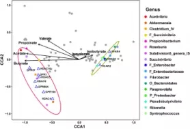 通過CCA相關(guān)性分析發(fā)現(xiàn),顯著上調(diào)的GPRs和HDACs與8個(gè)顯著增加的微生物屬(56個(gè) OTUS)是呈正相關(guān),顯著下調(diào)的GPRs和HDACs和9個(gè)顯著減少的細(xì)菌屬呈正相關(guān)(63個(gè)OTU),然而HDAC1與丁酸鹽的比例呈負(fù)相關(guān)。