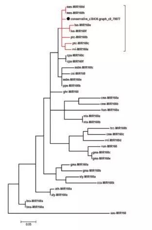 將成熟的miRNA比對到植物的ncRNA Database鑒定到19個miRNA。以MIR160家族為例進(jìn)行系統(tǒng)進(jìn)化分析:基于pre-miRNA序列來構(gòu)建MIR160家族系統(tǒng)進(jìn)化樹。結(jié)果顯示保守的c38436.graph_c0_79977與來自葡萄、楊樹、木薯和蓮花的MIR160形成了一個分枝,這也與山茶花的進(jìn)化地位相一致。