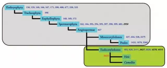 (1).為了鑒定山茶花中家系特異miRNA家族,對不同植物中的miRNA家族構(gòu)建進(jìn)化樹。發(fā)現(xiàn)2個葡萄特異的miRNA家族出現(xiàn)在山茶花中,其中miR3633是高豐度和高識別度的,表明它出現(xiàn)在葡萄和山茶花分化之前。