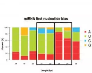 miRDeep2軟件鑒定175個潛在的miRNA。長度分布分析顯示21和22bp的miRNA豐度*高;對成熟miRNA的堿基偏好性分析:21和22bp的miRNA首位堿基偏好于“U”;23和24bp的miRNA首位堿基偏好于“A”。