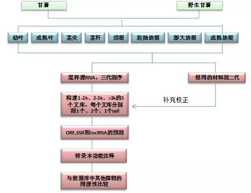甘薯和野生甘薯,不同組織(幼葉、成熟葉、莖尖、莖稈、須根、起始塊根、膨大塊根和成熟塊根)分別等重量混合,提取RNA用于三代測序;同樣的材料用于二代測序。
