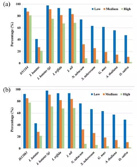 為了評估甘薯、野生甘薯的轉(zhuǎn)錄本和其他植物基因的相似性,我們比較了甘薯、野生甘薯與其他植物的開源CDS數(shù)據(jù)庫,包括紅苔藤、野生甘薯、牽?;?、煙草、馬鈴薯、大豆、擬南芥和水稻。結(jié)果表明甘薯和野生甘薯大多數(shù)的轉(zhuǎn)錄本都是同源的,說明這兩個物種擁有一個大致相同的基因庫。觀察高比例的轉(zhuǎn)錄本發(fā)現(xiàn),盡管這些物種中的大量基因在進(jìn)化過程中存在著巨大的差異,但仍然共有一些短的motif,說明這些基因在進(jìn)化上顯示出高度的保守性。