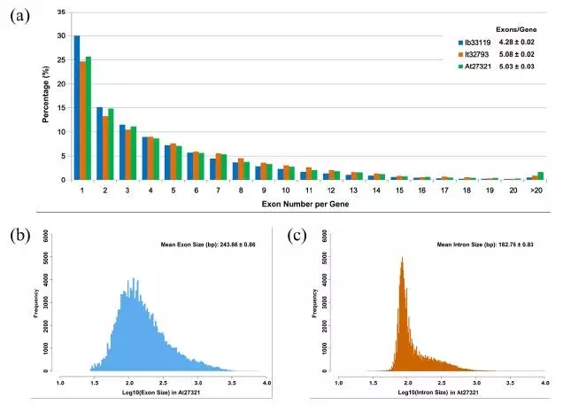 三代測序得到的全長cDNA對于研究基因的結(jié)構(gòu)非常有用,例如分析外顯子-內(nèi)含子的結(jié)構(gòu)。我們隨機(jī)挑選了50個基因進(jìn)行比較,發(fā)現(xiàn)這些基因含有的外顯子數(shù)目在甘薯、野生甘薯和擬南芥三個植物中的分布是相似的。