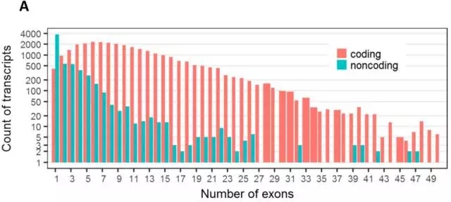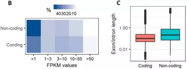 通過比對到參考蛋白數(shù)據(jù)庫,有30,183個轉錄本可編碼蛋白、6,003個轉錄本不能編碼蛋白,并且這些非編碼的轉錄本外顯子少、表達量低、且外顯子與內含子在長度上的比值相較于可編碼蛋白的轉錄本略高(Figure 3)。對轉錄本進行分類(Table 2)。