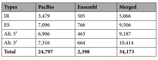 PacBio鑒定到多達24,797個AS事件,并對這些可變剪接進行分類統(tǒng)計(Table 1),在兔的參考基因組中僅發(fā)現(xiàn)2,398個AS事件,將數(shù)據(jù)合并后共得到34,173個AS事件,且可變剪接事件包含不同的4中類型,另外,鑒定到11,184個APA事件。挑選5個基因,并用圖表示出不同的isoform比對到參考基因模型上(Figure 2)。