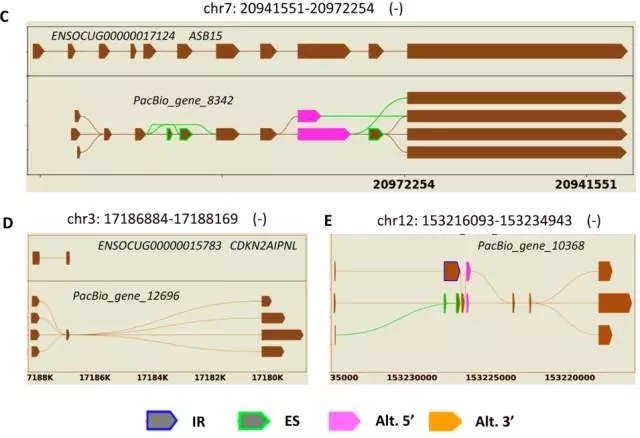 Figure 2. 三代測得轉錄本的不同isoforms,在數(shù)據(jù)庫中的參考基因模型如圖示中被標記有染色體位置、基因ID和基因名稱