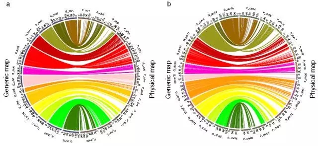 (1)遺傳圖與棉花物理圖譜共線性分析發(fā)現(xiàn)圖譜覆蓋度良好,絕大多數(shù)的SNP與物理圖譜的共線性良好,相對于A基因組而言,D基因組的共線性更好。