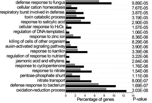 為了深入了解lmd體內(nèi)的分子水平變化,作者進(jìn)行了轉(zhuǎn)錄組測序。對差異基因進(jìn)行分析發(fā)現(xiàn)了許多與致病相關(guān)的基因,如WRKY、谷胱甘肽-轉(zhuǎn)移酶(GST)、乙烯反應(yīng)因子(ERF)和絲氨酸/蘇氨酸蛋白激酶(serine/threonine-protein kinase),這些都已經(jīng)被研究證實與防御反應(yīng)相關(guān)。GO富集分析顯示,參與催化活性、抗氧化活性、免疫系統(tǒng)過程和刺激響應(yīng)的差異基因發(fā)生了顯著富集(圖9)。