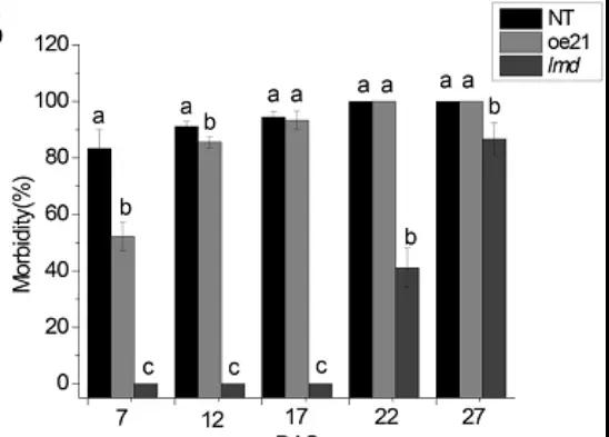 研究發(fā)現(xiàn)類病變突變體增強(qiáng)了對病原菌的抗性,為了測試lmd突變體是否對Alternaria alternata有抗性,作者將孢子懸浮液噴灑在NT、oe21和lmd幼苗上。7天之后,NT和oe21感染嚴(yán)重,出現(xiàn)了幾片枯萎葉片,而在lmd突變體中觀察到的枯萎葉片很少,盡管其葉片上有許多病變(圖11)。噴施17天后,NT和oe21的發(fā)病率均在90%以上,但lmd仍未出現(xiàn)感染葉片。lmd的發(fā)病時間出現(xiàn)在噴灑后22天,而此時,lmd的發(fā)病率為45.55%,但NT和oe21的發(fā)病率均為100%(圖12)。