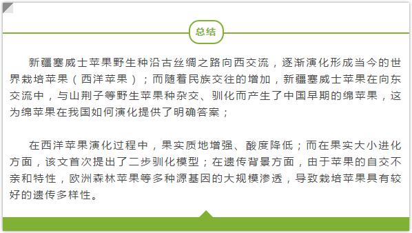 研究發(fā)現(xiàn),從新疆境內(nèi)采集的塞威士蘋果保持較高的同源性、最原始,而同屬中亞地區(qū)的哈薩克斯坦境內(nèi)的塞威士蘋果基因雜合度則相對(duì)較高。這充分說(shuō)明,世界栽培蘋果起源于中國(guó)新疆。該研究確認(rèn)全世界 蘋果的共同祖先是新疆野蘋果,歐洲的森林蘋果作為重要的基因貢獻(xiàn)者與現(xiàn)代蘋果之間存在大規(guī)?;驖B透。