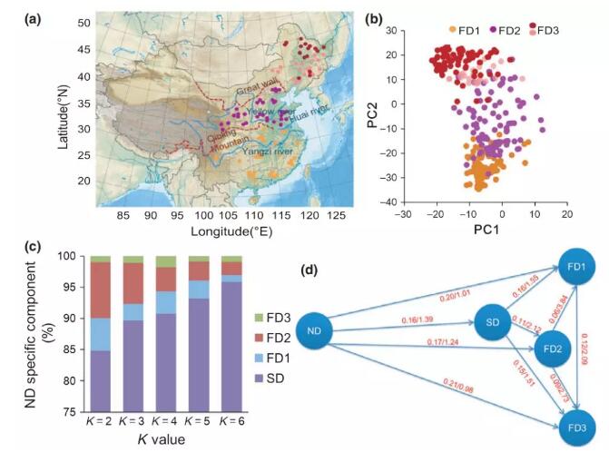(2)通過基因滲透和PCA分析推出半馴化品種是一種進化上的中間產(chǎn)物,而不是馴化品種和野生大豆雜交產(chǎn)生的,此外,三群體檢測的結(jié)果也進一步論證了這一點,同時,論證出栽培大豆是從中部黃淮海地區(qū)向北向南馴化,進而將中國馴化大豆起源√確的定位到中國中部黃淮海區(qū)域。