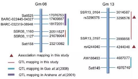(2)在前人研究基礎上,利用Gm01, Gm08, Gm11和Gm13上的78個SSR構(gòu)建遺傳圖譜,在Gm13上定位到主效QTL位點Oswm13-1。