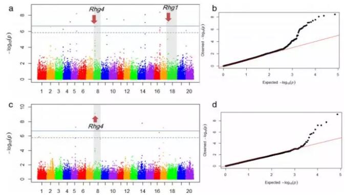 (2)通過全基因組關聯(lián)分析找到19個與胞囊線蟲抗性相關的位點,其中8個位點與之前報道過的QTL位點重合,8個位點與已經(jīng)報道的抗胞囊線蟲基因Rhg4及Rhg1連鎖,并鑒定出3個新的QTL位點。通過基因注釋獲得到與抗病,細胞色素P450,蛋白激酶等相關的功能基因。