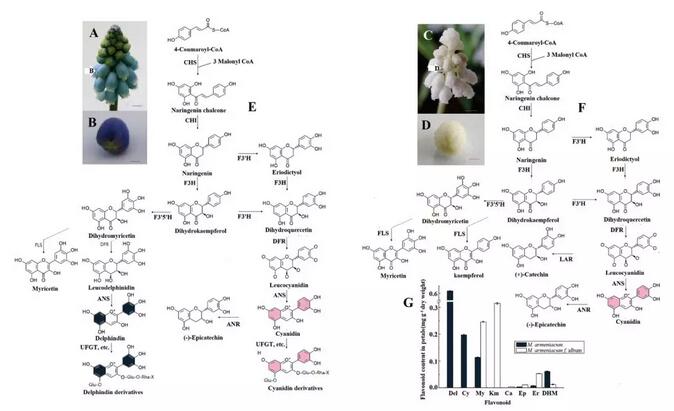 葡萄風(fēng)信子(Muscari)是一種重要的觀賞性球根植物,具有獨特藍(lán)色、花形和甜香。天然突變種白色風(fēng)信子為探究某些潛在生化特征,特別是顏色相關(guān)的復(fù)雜代謝網(wǎng)絡(luò)研究提供了機會。據(jù)報道,花青素是風(fēng)信子花色的主要色素。藍(lán)色花主要由飛燕草色素(Del)決定,紅色花由花青色素(Cy)決定?;ㄇ嗨厥侵参锟茖W(xué)中研究最多和最了解的化合物之一,然而,在不同植物中調(diào)控花青素分解代謝的分子機制還遠(yuǎn)遠(yuǎn)沒有定論。