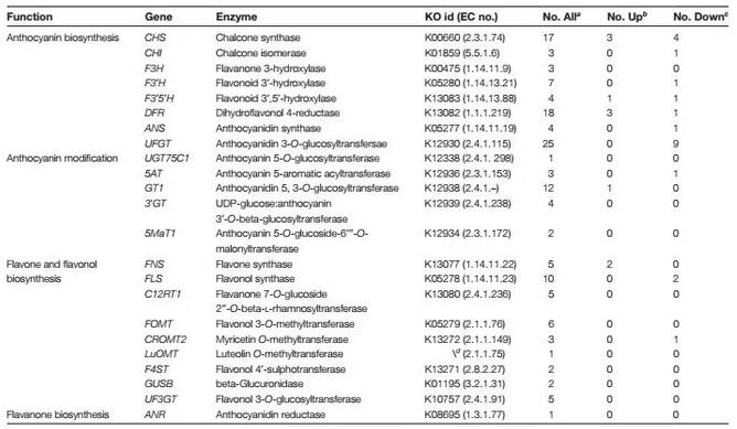 通過轉(zhuǎn)錄組和代謝組技術(shù),不僅可以對轉(zhuǎn)錄水平進(jìn)行研究,還可以對代謝產(chǎn)物進(jìn)行比較分析,從而深入解析決定表型的分子調(diào)控機制。本研究首次使用轉(zhuǎn)錄組和代謝組聯(lián)合分析,揭示與風(fēng)信子花色素沉著相關(guān)的主要代謝途徑,并且挖掘針對植物中色素沉積相關(guān)的關(guān)鍵基因。