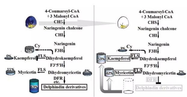 在藍(lán)色風(fēng)信子中檢測到與Del合成相關(guān)的部分同源序列的表達(dá)上調(diào),在某些情況下,高出> 1000倍。結(jié)合HPLC分析結(jié)果,DFR可能是白色葡萄風(fēng)信子中藍(lán)色色素沉積(Del)消失的靶基因。另外,F(xiàn)LS和DFR在共同的二氫楊梅素底物之間的強烈競爭,可能部分地阻斷Del的合成并引起其他類黃酮化合物,如楊梅素的產(chǎn)生,由此進(jìn)一步消除白色風(fēng)信子中藍(lán)色色素沉積。