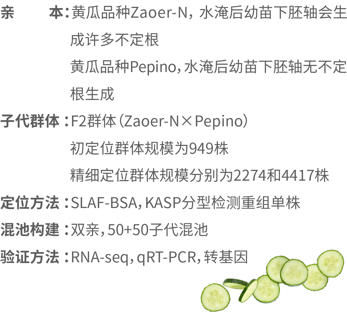 黃瓜是重要的蔬菜品種,其根生長淺,對氧氣需求較為嚴格,這造成它對水淹脅迫非常敏感。在水淹脅迫下,黃瓜下胚軸通過產(chǎn)生不定根來獲取氧氣,以適應水淹脅迫。為解析水淹脅迫下黃瓜不定根生產(chǎn)現(xiàn)象的遺傳學機制,研究者曾利用耐水淹材料Zaoer-N 和不耐水淹材料Pepino構(gòu)建的群體進行QTL定位,已經(jīng)分離了一個控制不定根數(shù)目的主效QTL ARN6.1,該QTL在多年的實驗均解釋了較高的表型貢獻率。本研究將對該QTL進行精細定位,確定引起性狀差異的基因,并進行多方面的驗證。