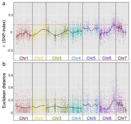 利用SLAF-seq的方法對親本及兩個極端混池進行測序,親本測序深度分別為29.18×和22.85×,兩個混池的深度分別為50.6×和53.72×,以9930為參考基因組,利用△SNP-index和ED的方法計算顯著關(guān)聯(lián)位點,將關(guān)聯(lián)區(qū)域定位在6號染色體標記SLAF_marker_192310和SLAF_marker_192096之間,區(qū)間大小301kb(圖3)。