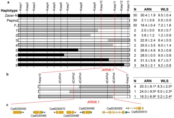 利用定位區(qū)間側(cè)翼SLAF標記(SLAF_marker_192310和SLAF_marker_192096)上的SNP,分別各開發(fā)KASP標記(KASP1和KASP13),并對2274個F2子代進行分型,獲得33個重組個體;再在KASP1和KASP13之間開發(fā)11個KASP標記,對33個重組個體進行基因分型,共得到8種單倍型。結(jié)合重組個體基因分型和表型數(shù)據(jù),將ARN6.1定位到61.5kb的區(qū)間(KASP10和KASP11)(圖4a)。為進一步縮小區(qū)間,利用KASP10和KASP11對4417個F2個體進行分型,得到6個重組個體,這6個重組個體分別自交得到6個F2:3家系,然后利用新開發(fā)的5個dCAPS對F2:3家系進行分型,結(jié)合所有表型數(shù)據(jù),最終將ARN6.1定位在36.1kb的范圍內(nèi)(圖4b)。對該區(qū)進行注釋,共有7個基因(圖4c),有趣的是,其中5個基因都被預測為編碼AAA 型的ATP酶家族蛋白。