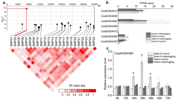 2個親本重測序分析,在36.1kb的區(qū)間內(nèi)開發(fā)到25個SNP,為確定哪個SNP與性狀真實相關(guān),研究者對100個黃瓜自交系的23個SNP(2個SNP只存在于Zaoer-N中而被過濾掉)進行分型,結(jié)合每個自交系不定根數(shù)目的表型數(shù)據(jù)進行局部關(guān)聯(lián)分析,結(jié)果顯示SNP02與表型有較強的關(guān)聯(lián)性。對SNP02分析發(fā)現(xiàn),其位于Csa6G504460的第二外顯子,可能就是引起變異的SNP位點(圖5a)。