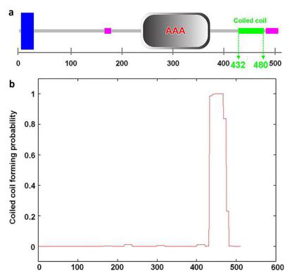 基因組和cDNA序列分析顯示,CsARN6.1擁有2個外顯子,被預測為編碼含有511個氨基酸殘基的AAA-ATPase結(jié)構(gòu)域蛋白,該蛋白中含有一個coiled-coil結(jié)構(gòu)域(圖6),前期關(guān)聯(lián)到的SNP02即位于該結(jié)構(gòu)域,由于該SNP的突變導致Asp被替換成Gly,Zaoer-N為CsARN6.1^Asp型,表現(xiàn)出較強的ATP酶活性,而Pepino為CsARN6.1^Gly型,幾乎沒有ATP活性(圖7)。