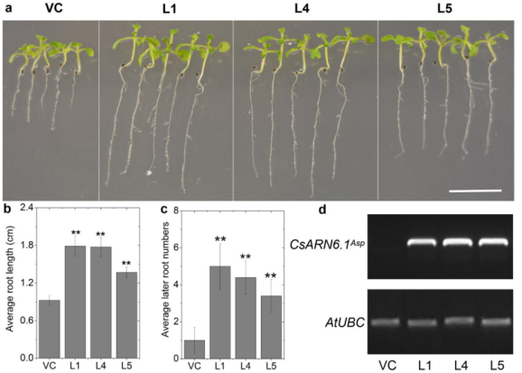 為驗證CsARN6.1的功能,將CsARN6.1^Asp轉(zhuǎn)入擬南芥中,發(fā)現(xiàn)轉(zhuǎn)基因植株的根長顯著長于對照,同時,轉(zhuǎn)基因植株上可以明顯觀察到側(cè)根發(fā)育,而對照組則沒有側(cè)根發(fā)育(圖8)。為進一步驗證,研究者將CsARN6.1^Asp轉(zhuǎn)入黃瓜品種Xintaimici(CsARN6.1^Gly型),并經(jīng)多代自交和篩選,獲得單拷貝的純合轉(zhuǎn)基因植株。發(fā)芽后3天,轉(zhuǎn)基因植株的初生根長度顯著長于野生型。水淹處理后,轉(zhuǎn)基因黃瓜下胚軸中CsARN6.1的表達量顯著高于野生型。處理后7天,轉(zhuǎn)基因黃瓜下胚軸的不定根數(shù)目明顯高于野生型(圖9 e.f.g.h)。另外,野生型黃瓜葉片和子葉的萎黃病較轉(zhuǎn)基因黃瓜嚴重。以上轉(zhuǎn)基因結(jié)果證實CsARN6.1能夠促進不定根形成和黃瓜水淹耐受力(圖9 i.j)。