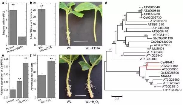進化樹分析顯示,CsARN6.1與擬南芥At2G18190和At3G50930存在較高的同源性(圖10d),而在之前研究中發(fā)現(xiàn),H2O2處理擬南芥后,At2G18190.1和At3G50930.1被顯著誘導表達。水淹后植物體內(nèi)H2O2積累是普遍的生理響應。因而研究者嘗試在水中加入H2O2后處理Zaoer-N幼苗,與無水處理的對照相比,48h后處理組植株CsARN6.1的表達量是對照組的4.3倍,與不加H2O2的水處理的對照相比,48h后CsARN6.1的表達量是對照組的2.1倍(圖10 e)。5天后統(tǒng)計不同處理的材料下胚軸不定根數(shù)目,發(fā)現(xiàn)與不加H2O2的水處理的對照相比,水中加入H2O2的處理組的不定根數(shù)目增加60%(圖10 f.g)。