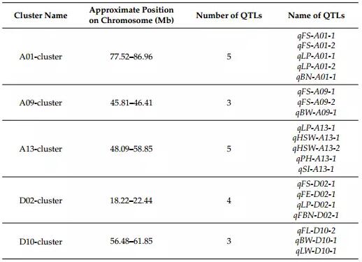 作者以10 Mb(?20 cM)物理區(qū)域包含兩個(gè)或多個(gè)QTL定為QTL簇標(biāo)準(zhǔn)。在5條染色體上檢測到5個(gè)QTL簇,每個(gè)簇至少有3個(gè)QTL(表1)。其中3個(gè)位于A基因組,2個(gè)位于D基因組中。鑒定出含有影響纖維品質(zhì)和產(chǎn)量性狀的多個(gè)QTL的基因組區(qū)域,有利于后期分子改良。