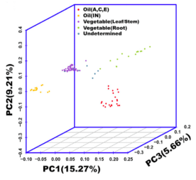 利用主成分分析來評估遺傳變異,分析結(jié)果顯示主要分為4個群:Vegetable(Leaf/Stem),Vegetable (Root),Oil (IN)和Oil (A,C,E),該結(jié)果與系統(tǒng)發(fā)育樹結(jié)果一致。
