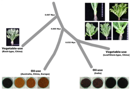 研究中還發(fā)現(xiàn)了Vegetable (Root)型最先分化,然后是Oil (A,C,E),最后是Oil (IN) 與Vegetable (Leaf/Stem)的分化,并計算分化時間,分別是:0.067 Mya,0.065 Mya和0.032 Mya