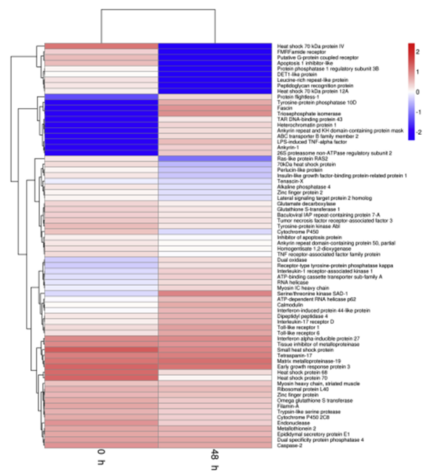 2017年,中國水產(chǎn)科學院喻達輝老師在百邁客云平臺上對合浦珠母貝免疫相關數(shù)據(jù)進行分析,2篇文章(合浦珠母貝)先后分別發(fā)表于同一個雜志《Fish & Shell?sh Immunology》,這兩篇文章中都進行了聚類熱圖分析。第一篇文章中研究人員將免疫相關差異表達基因按照不同時期進行分層聚類分析,第二篇文章中研究人員將不同時期的unigene進行了聚類熱圖分析,為后續(xù)研究結果的呈現(xiàn)做了較好的鋪墊作用。
