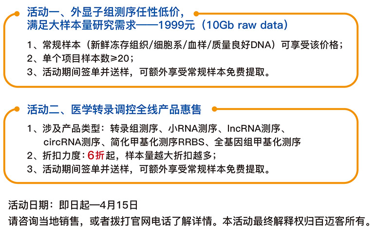 開學(xué)季,放禮季,百邁客醫(yī)學(xué)產(chǎn)品全線促銷活動開啟。百邁客全外顯子組測序(10Gb/樣本,Q30>85%),主流外顯子捕獲平臺羅氏NimbleGen SeqCap EZ Exome Library V3和安捷倫 SureSelect Human All Exon V6,一律1999元/樣本?。ǖ饶銇韮旛r)