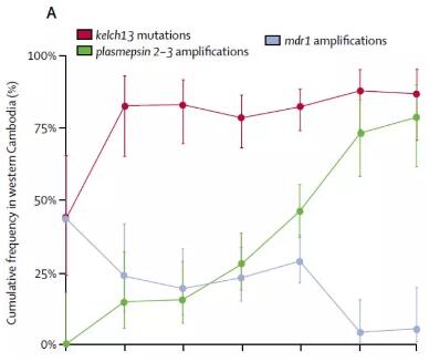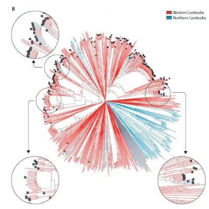 研究人員通過(guò)對(duì)來(lái)自于東南亞的1492例惡性瘧原蟲樣本的基因組序列數(shù)據(jù)分析,其中包括2007至2013年間在柬埔寨西部收集的464個(gè)惡性瘧原蟲樣本,耐藥性的不同流行病學(xué)起源通過(guò)對(duì)Kelch13青蒿素耐藥基因座和plasmepsin 2-3 哌喹耐藥基因座的單倍型分析進(jìn)行鑒別。最終確定了30多個(gè)獨(dú)立的青蒿素耐藥性起源,其中91%為KEL1譜系(140/154)為耐受雙氫青蒿素哌喹抗性的寄生蟲。2008年,KEL1譜系和與哌喹抗性相關(guān)PLA1譜系相結(jié)合。2013年,KEL1/PLA1 結(jié)合譜系在柬埔寨西部頻率達(dá)到63%(24/38),并已蔓延至柬埔寨北部。
