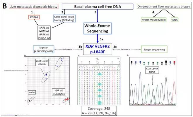 西班牙國(guó)家癌癥研究中心(CNIO)胃腸癌臨床研究組的學(xué)者們,納入一例RAS / BRAF / PIK3CA未發(fā)生突變且對(duì)抗VEGF抑制劑具有抗性的轉(zhuǎn)移性結(jié)腸直腸癌患者,收集其血漿提取cfDNA,分離白細(xì)胞提取gDNA以及轉(zhuǎn)移組織提取tDNA,進(jìn)行全外顯子組測(cè)序,發(fā)現(xiàn)WES-cfDNA與腫瘤外顯子組測(cè)序結(jié)果一致率為77%,且能夠鑒別KDR / VEGFR2 L840F克隆,該體細(xì)胞突變是患者難治性的原因。其他腫瘤數(shù)據(jù)庫(kù)如TCGA等KDR體細(xì)胞突變的樣本比例在1-3%,且位于其他癌癥相關(guān)激酶(如EGFR,ABL1和ALK)中經(jīng)常突變的蛋白質(zhì)殘基中。此外,作者還進(jìn)行了一系列功能實(shí)驗(yàn),包括不同細(xì)胞系VEGFR2突變體異位表達(dá)、激酶和藥物敏感性測(cè)定以及細(xì)胞和患者衍生的異種移植瘤實(shí)驗(yàn)。結(jié)果表明,L840F對(duì)抗血管生成藥物產(chǎn)生強(qiáng)烈的抗性,而KDR熱點(diǎn)突變體R1032Q賦予對(duì)強(qiáng)VEGFR2抑制劑的敏感性。小鼠移植瘤實(shí)驗(yàn)表明VEGFR2突變體D717V,G800D,G800R,L840F,G843D,S925F,R1022Q,R1032Q和S1100F 促進(jìn)小鼠腫瘤生長(zhǎng)。