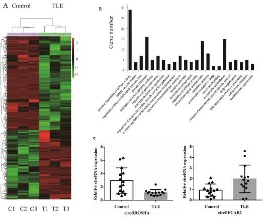 在本研究中,為了評估circRNA在人體內(nèi)的作用,作者采用了高通量測序方法,測定TLE患者和非TLE患者顳葉新皮質(zhì)中circRNA表達水平,并對環(huán)狀RNA的功能進行了注釋。作者描述了一個包含潛在基因與circRNA-miRNA的網(wǎng)絡。