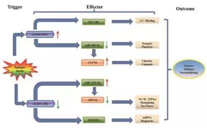 最近的基因組學研究揭示了許多與各種疾病的基因調(diào)控相關的非編碼RNA (ncRNAs)。人類癲癇中非編碼RNA的表達也發(fā)生了改變,可以作為一種新的、非侵入性的生物標志物來改善目前的癲癇診斷。環(huán)狀RNA (circRNAs)是一種獨特的非編碼環(huán)狀RNA,circRNA與microRNAs (miRNAs)相互作用,并作為miRNA海綿,通過circRNA-miRNA-mRNA網(wǎng)絡在神經(jīng)系統(tǒng)疾病中調(diào)節(jié)基因表達。研究表明環(huán)狀RNA在神經(jīng)元功能中發(fā)揮重要作用,尤其是在突觸中。組織學研究結(jié)果證實,邊緣系統(tǒng)的突觸重組似乎能逐漸增強皮質(zhì)興奮性,并可能導致癲癇發(fā)作。然而,circRNAs在癲癇中的作用仍是未知的。