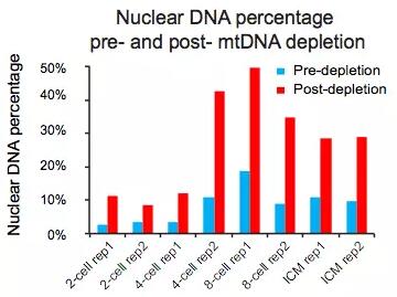 ATAC測(cè)序和轉(zhuǎn)錄組一樣,也是有時(shí)空特異性,但是由于ATAC測(cè)序建庫的時(shí)候需要對(duì)細(xì)胞進(jìn)行裂解提取細(xì)胞核,再通過轉(zhuǎn)座酶對(duì)細(xì)胞核中正在轉(zhuǎn)錄組的染色體序列進(jìn)行酶切,那么我們對(duì)實(shí)驗(yàn)處理中的細(xì)胞活性就有一定的要求—不能用凍存后的細(xì)胞來建庫;另外,由于轉(zhuǎn)座酶對(duì)DNA序列進(jìn)行酶切的時(shí)候,只要是轉(zhuǎn)座酶可以接近的區(qū)域都可以進(jìn)行酶切,這就造成了測(cè)序數(shù)據(jù)中有好大一部分是線粒體的DNA序列,這些DNA我們認(rèn)為是污染的部分,會(huì)盡量用探針進(jìn)行除去,但是探針去除的效率也有限。如在小鼠胚胎不同發(fā)育時(shí)期的ATAC測(cè)序?qū)嶒?yàn)中,作者對(duì)探針去除線粒體DNA的效率進(jìn)行了鑒定[2],所測(cè)結(jié)果如圖1,可見核DNA最多的時(shí)候占比也僅僅有50%,那么相比較而言線粒體DNA的去除也就相當(dāng)重要了;而植物細(xì)胞,由于其細(xì)胞壁結(jié)構(gòu)不能直接通過酶對(duì)細(xì)胞進(jìn)行裂解,并且測(cè)序結(jié)果中有好大一部分是葉綠體DNA污染,因此在做植物的ATAC測(cè)序時(shí),則需要將植物細(xì)胞制備成原生質(zhì)體,并且用梯度離心法來收集細(xì)胞核后再進(jìn)行建庫[5]。不管是線粒體DNA還是葉綠體DNA的污染,都可以在建庫之后進(jìn)行少量數(shù)據(jù)測(cè)序,通過簡單的比對(duì)分析,來大概估測(cè)文庫中的污染占比,從而決定是否正式進(jìn)行測(cè)序。