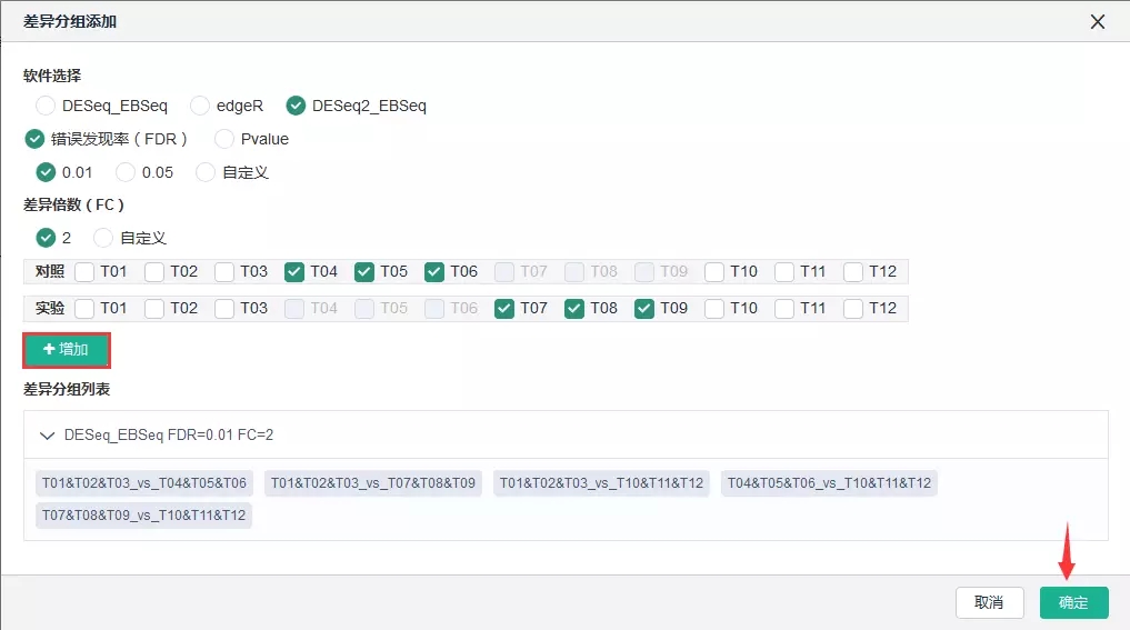 登錄百邁客云(www.biocloud.net)——我的項(xiàng)目——進(jìn)入相應(yīng)項(xiàng)目【報告】——差異基因挖掘——差異表達(dá)基因集查詢——添加差異分組、自定義軟件、自定義參數(shù)(FDR(或者p-value)、FC、添加對照組及實(shí)驗(yàn)組)——【添加】——【確定】。