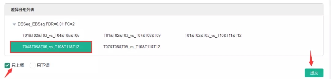 登錄百邁客云(www.biocloud.net)——進(jìn)入相應(yīng)項(xiàng)目【報告】——差異基因挖掘—差異表達(dá)基因集查詢——點(diǎn)擊相應(yīng)差異分組并選擇“只上調(diào)/只下調(diào)”,最后點(diǎn)擊“提交”。